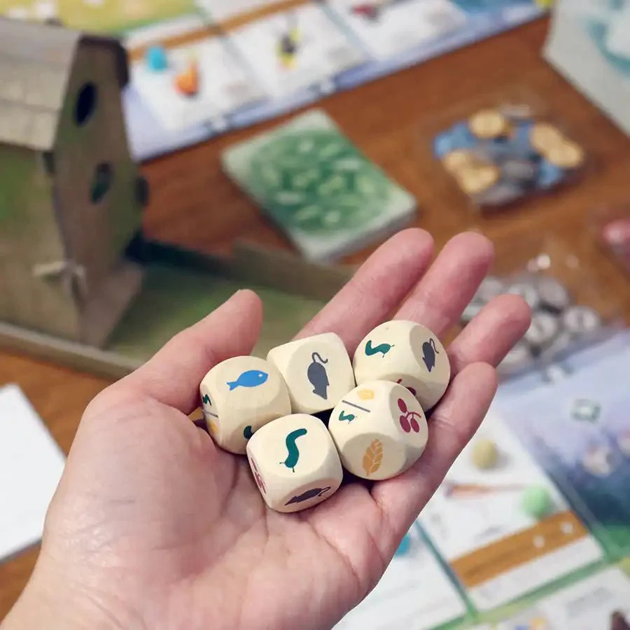 • Gain food tokens via custom dice in a birdfeeder dice tower